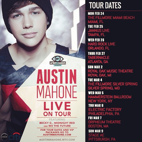 Austin Mahone’s MTV Artist To Watch Tour featuring Midnight Red kicks off today, February 24th!  The tour, originally scheduled for October 2013, was postponed after Austin fell ill and had to reschedule.  We’re glad Austin’s feeling better & are so excited for this tour!  Even more so after watching his amazing Jingle Ball performances.
